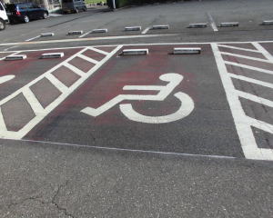 駐車場の白線ライン工事完了後に、今まで普通の駐車ボックスの上を、ペンキで塗装をする事により、車椅子マークを設置する工事です。