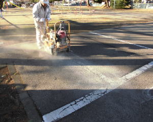 まず、チョークによる作図を行い、区画線の確認をします。よろしければ、作業に入ります。